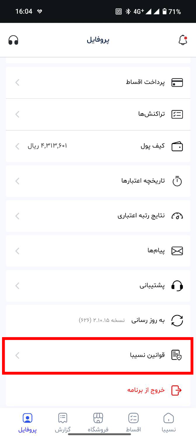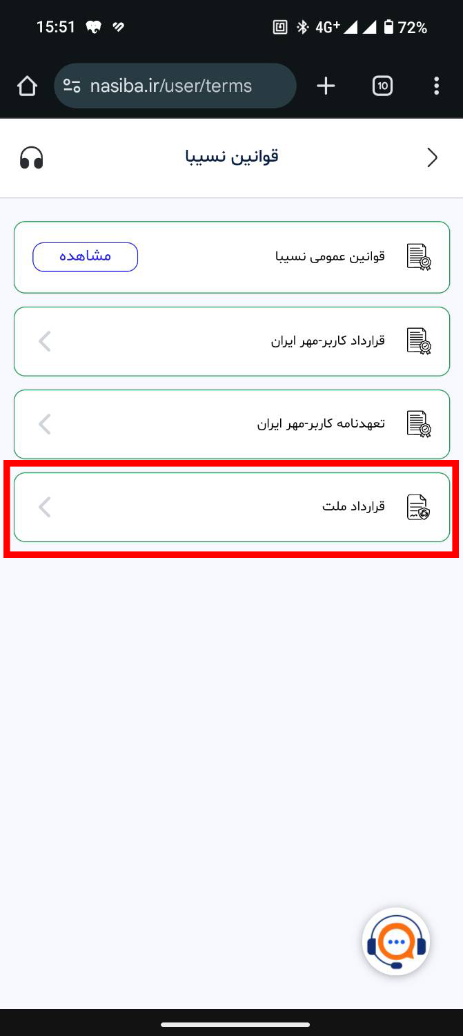 توجه داشته باشید اگر تسهیلات بانک ملت را از طریق نسیبا دریافت کرده اید، برای دریافت شماره قرارداد خود، لطفاً وارد پنل کاربری نسیبا شوید. سپس به بخش پروفایل مراجعه کرده و گزینه قوانین نسیبا را انتخاب کنید. در این بخش، شماره قرارداد شما قابل مشاهده خواهد بود.